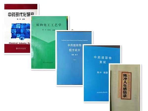 他已经出版的著作有四本,《植物化工工艺学》1995年西北大学出版社出版;《中药现代化研究》2006年化学工业出版社出版:《陈冲人生感悟录》2003年陕西人民美术出版社出版;《中药提取物鉴别与质量标准参考》2013年化学工业出版社出版。