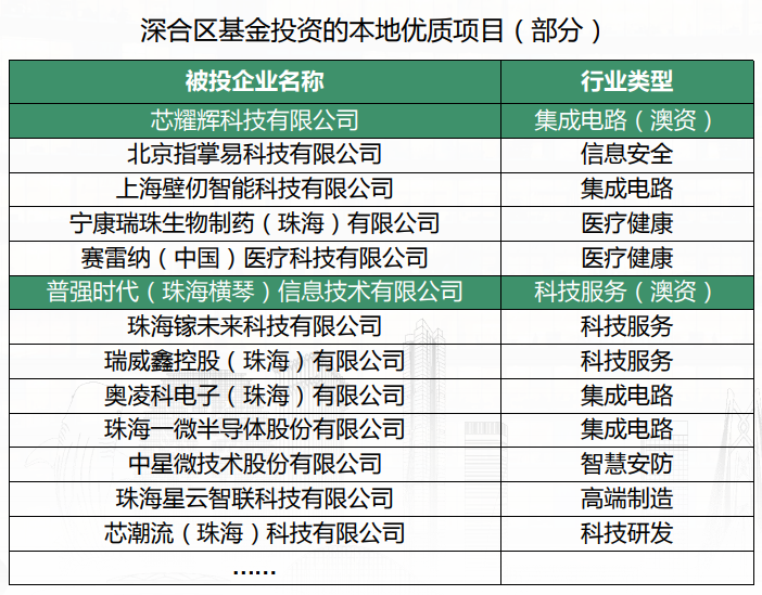 横琴深合区发挥创业投资基金、私募股权投资基金聚集优势,引导基金重点投向本地科技研发和高端制造项目,现已投资一批本地优质项目,如下图所示: