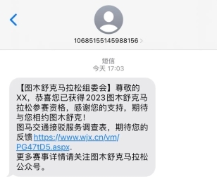所有选手报名时预留的手机号码,均会收到图马报名抽签结果的短信通知。中签的朋友请及时填写并提交短信内的“交通接驳服务调查”