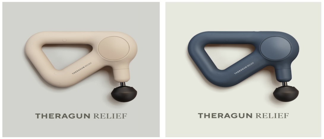 Theragun Relief三角筋膜枪轻享版有奶昔白、海军蓝两种配色,售价为人民币1299元;