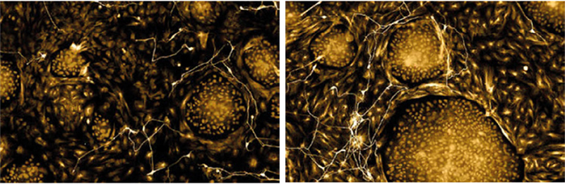 *体外研究(神经细胞与表皮细胞共同培养)显示,使用动态黑蜂修护科技处理30小时后,与未经处理的对照组相比,神经细胞的生长受到三倍强化刺激。