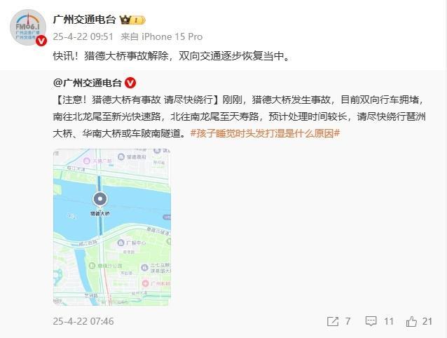 当天7时46分,广州交通电台发布消息称,猎德大桥发生事故,目前双向行车拥堵,南往北龙尾至新光快速路,北往南龙尾至天寿路,预计处理时间较长,请尽快绕行琶洲大桥、华南大桥或车陂南隧道。9时51分,猎德大桥事故解除,双向交通逐步恢复中。