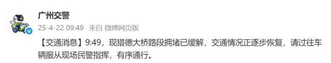 9时49分,广州交警微博提醒,现猎德大桥路段拥堵已缓解,交通情况正逐步恢复,请过往车辆服从现场民警指挥,有序通行。早前在桥顶活动的人员已下桥。