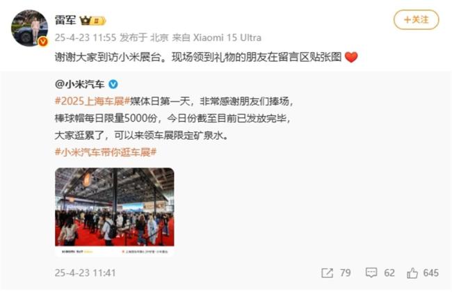 4月23日至5月2日,两年一届的上海车展在国家会展中心(上海)举行,小米汽车也参与其中。23日中午,小米汽车官方微博发文感谢朋友们捧场,并提到媒体日第一天发放了限量5000份的棒球帽,同时提供车展限定矿泉水供参观者领取。随后,小米集团创始人雷军转发了这条微博,邀请领到礼物的朋友在留言区分享照片。
