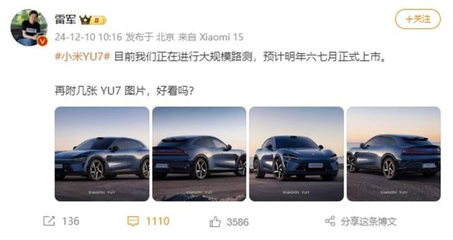 雷军曾在2024年12月10日发文预热小米SUV,表示目前正在进行大规模路测,预计明年六七月正式上市。他在配图中晒出4张小米SUV的外观图,网友们在评论区纷纷表达期待,并预祝大卖。