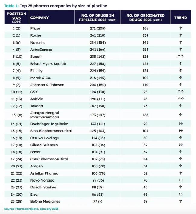 自主创新能力的质变式提升,已成为中国制药企业在全球最显著的竞争优势。从Pharmaprojects所统计的数据来看,对比上年同期,TOP25阵营中恒瑞以绝对优势(163项)领跑自研管线榜单,中生制药(104项)与石药集团(84项)同样表现亮眼,其自主研发规模甚至已超越艾伯维、武田等跨国制药巨头。