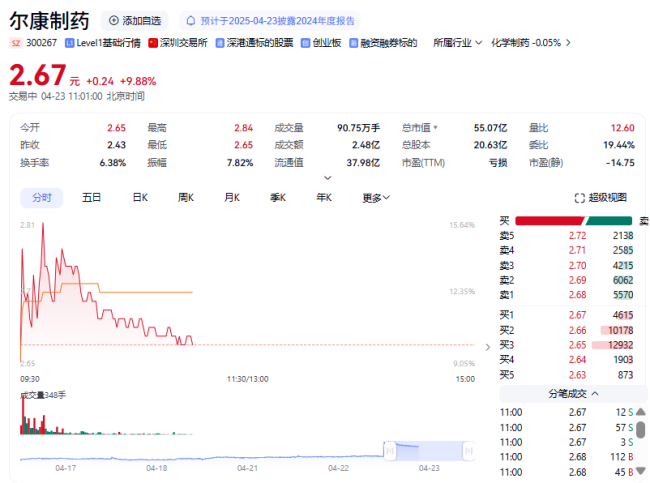4月23日,尔康制药(300267)盘中股价大涨,一度涨逾15%。截至北京商报记者发稿,尔康制药报2.72元/股,涨幅为11.93%。