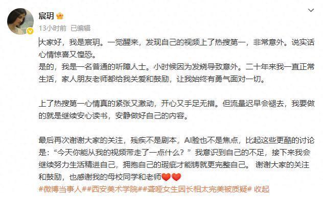 当晚,当事人宸玥发文回应:大家好,我是宸玥。一觉醒来,发现自己的视频上了热搜第一,非常意外。心情既惊喜又惶恐。