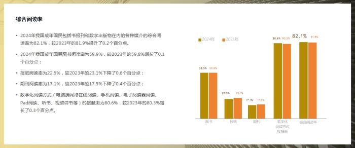 从阅读率来看,本次调查发现,2024年我国成年国民各媒介综合阅读率小幅增长,图书阅读率稳步提升。2024年我国成年国民包括书报刊和数字出版物在内的各种媒介的综合阅读率为82.1%,较2023年的81.9%提升了0.2个百分点。