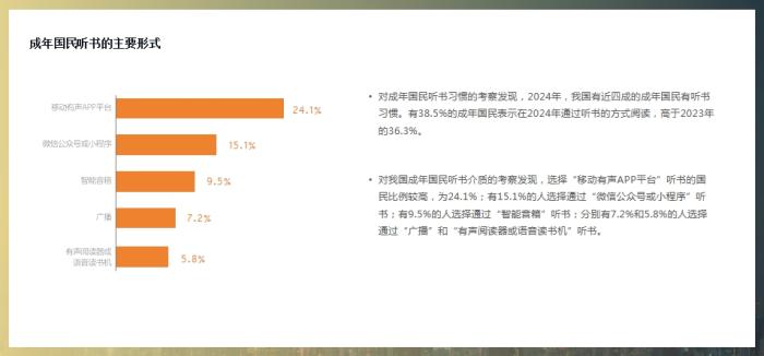 此外,对成年国民听书习惯的考察发现,2024年我国有近四成的成年国民有听书习惯。调查数据显示,有38.5%的成年国民表示在2024年通过听书的方式阅读,高于2023年的36.3%。