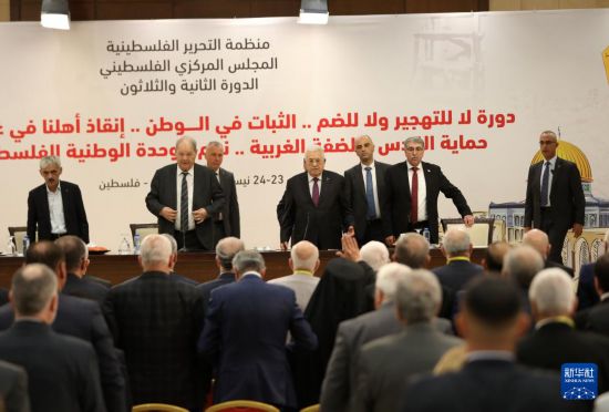 4月23日,巴勒斯坦总统阿巴斯(中)在约旦河西岸城市拉姆安拉出席巴勒斯坦解放组织(巴解组织)中央委员会第32次会议。新华社发(艾曼·诺巴尼摄)