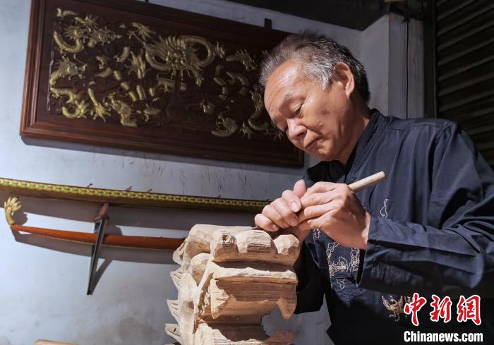 4月24日,湖南汨罗龙舟手艺匠人、许氏龙舟制造技艺传承人许桂生正在制作龙头。中新社记者 刘双双 摄