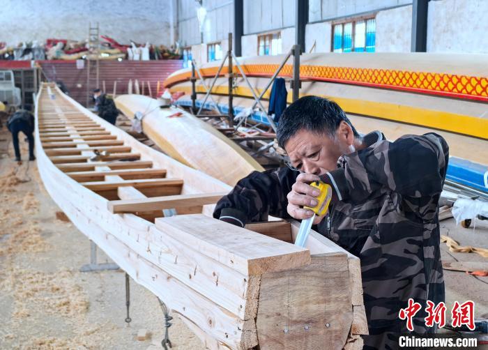 4月24日,湖南汨罗市屈子祠镇一龙舟制造厂工人正抓紧制作龙舟。端午节前,聚集10余家龙舟厂的屈子祠镇迎来造船旺季。中新社记者 刘双双 摄