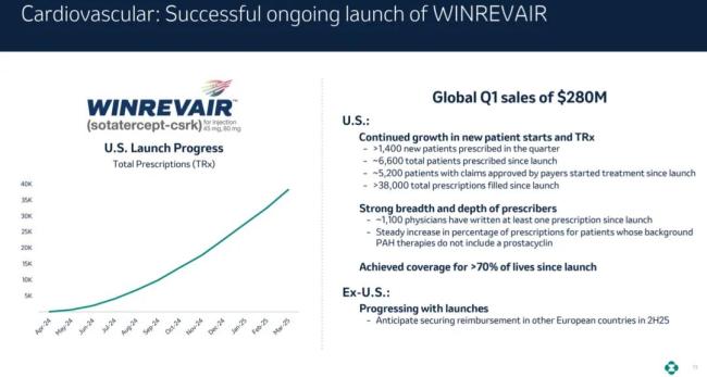 心血管领域,肺动脉高压(PAH)新药Winrevair收入2.8亿美元,该药物是第一个被批准用于治疗PAH的激活素信号抑制剂疗法,仅需每3周皮下注射一次。在III期ZENITH研究中,与安慰剂相比,Winrevair将PAH的全因死亡、肺移植和住院综合风险降低了76%,由于中期分析的压倒性疗效,该研究提前停止。