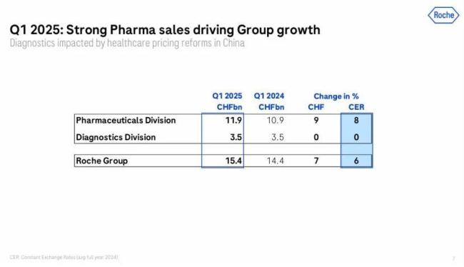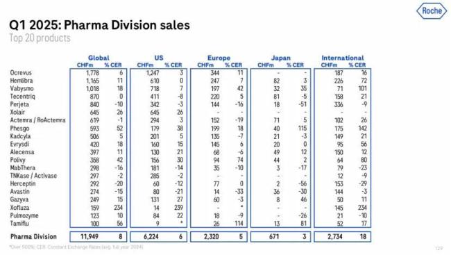 2025年第一季度,罗氏总营收154.40亿瑞士法郎(约172.40亿美元,按2025年平均汇率换算,1瑞士法郎=1.1166美元,下同),同比增长6%(按固定汇率计算),其中制药业务收入119.49亿瑞士法郎(约133.42亿美元,+8%),诊断业务收入34.91亿瑞士法郎(约38.98亿美元,与去年Q1持平)。此外,中国区制药业务实现了强劲增长(+14%)。