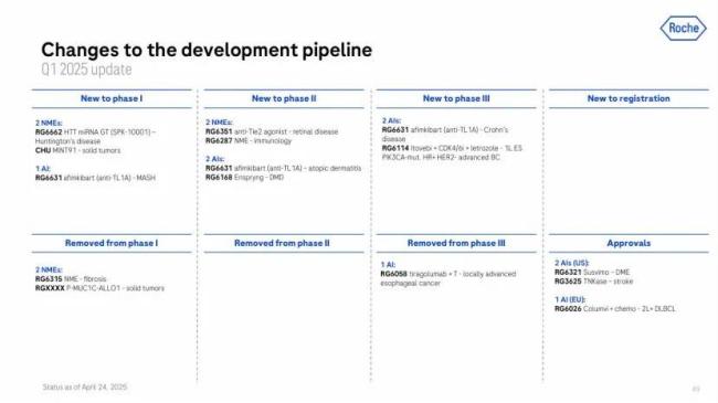 管线进展方面,罗氏透露了将在今年启动Aβ双抗Trontinemab治疗阿尔茨海默病的III期研究的计划,并披露了3个被剔除的项目,包括:①TGF-β3单抗RG6315治疗纤维化的I期研究②Muc1 CAR T细胞疗法P-MUC1C-ALLO1治疗实体瘤的I期研究③TIGIT单抗tiragolumab联合阿替利珠单抗治疗局部晚期食管癌的III期研究。