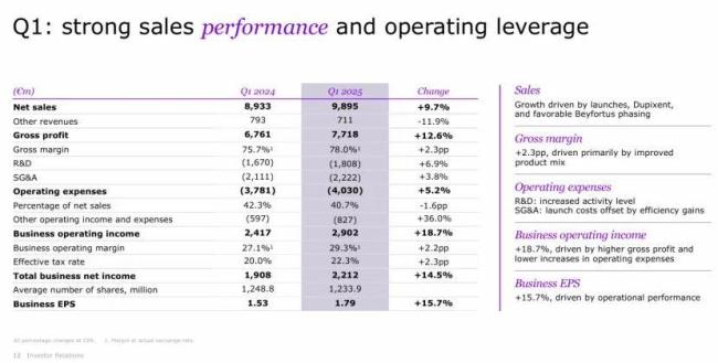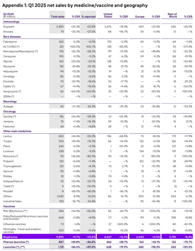 2025年第一季度,赛诺菲总营收98.95亿欧元(约104.57亿美元,按2025年平均汇率换算,1欧元=1.0568美元,下同),同比增长9..7%(按固定汇率计算,下同);研发投入18.08亿欧元(约19.11亿美元,+6.9%),占总营收的18.3%。