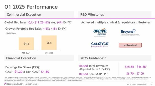BMS把产品划分为增长产品(Growth Products)和成熟产品(Legacy Products),一季度增长产品收入为56亿美元(+16%),主要由Opdivo、Breyanzi、Reblozyl、Camzyos和Cobenfy等产品驱动。鉴于这一增长,BMS将2025年收入指引上调至458亿~468亿美元。