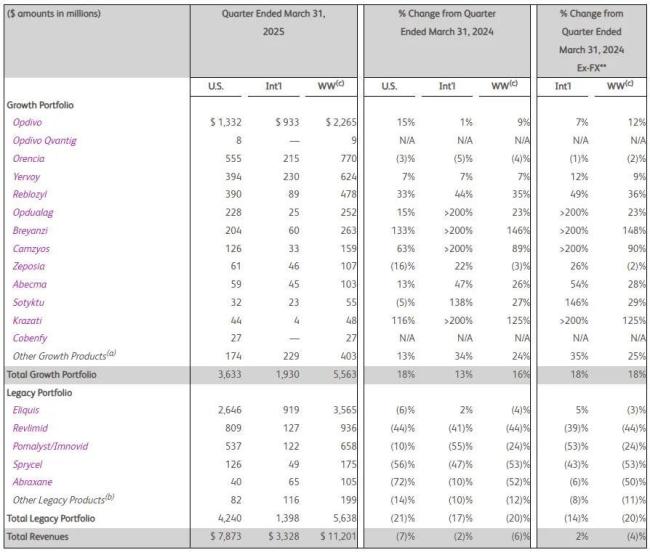 2025年第一季度,BMS总收入为112亿美元(-6%),其中美国收入为79亿美元(-7%),其他地区收入为33亿美元(-2%)。