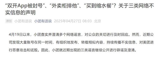4月27日早间,美团通过官方微信公众号“小团有话说”发布声明,针对网络上流传的三类不实信息进行澄清。声明中提到,尽管此前已澄清“去其他平台跑单会被美团永久封号”的谣言,但社交平台上仍出现骑手App显示“永久停止接单原因为:存在使用双开或京东软件的行为”的谣言图片。经核实,该图片源自平台封禁违规抢单外挂的正常提示页,但有个别网民对图片进行了恶意P图并在微信群内传播。目前,公司已固定证据,将通过法律手段维护自身权益,并加大打击力度。