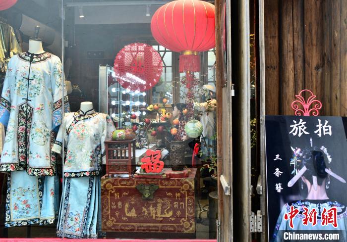 图为5月5日,头戴“三条簪”身着汉服的游客在福州三坊七巷打卡留影。中新社记者 张斌 摄