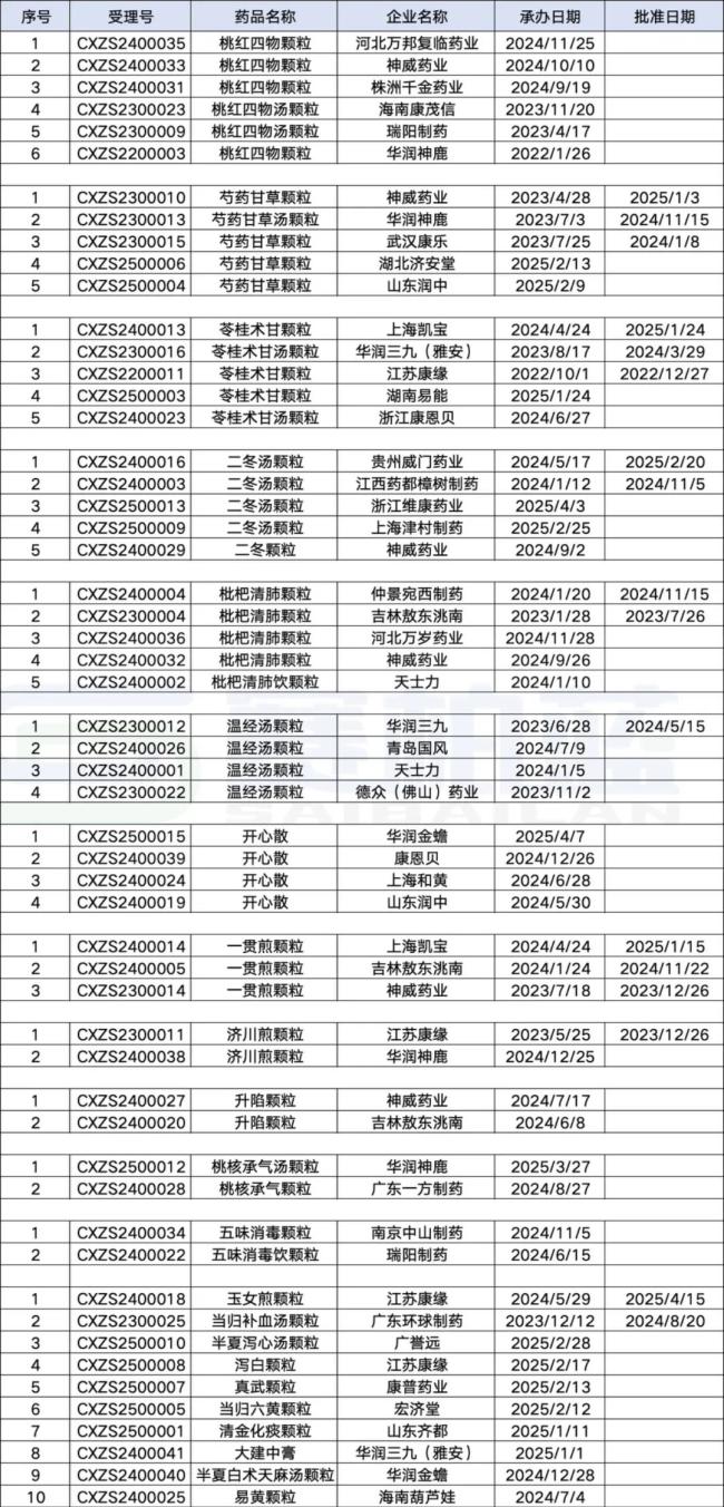 截至2025年4月,已有60家企业按3.1类提交申请(含已获批上市),涉及21首方剂。