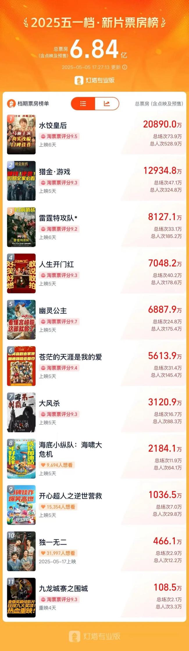 此外,刘德华欧豪主演的经济犯罪电影《猎金·游戏》、漫威科幻动作片《雷霆特攻队*》、易小星执导喜剧《人生开门红》、宫崎骏动画电影《幽灵公主》等票房排名均在前列。不过,除《水饺皇后》《猎金·游戏》两部影片票房破亿外,其余影片并未呈现断崖式票房差距。