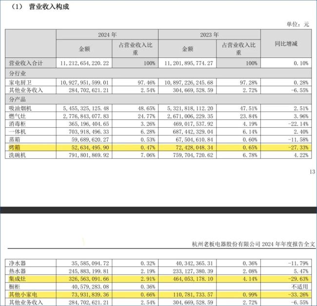 老板电器产品线的结构性危机在2024年进一步加剧。数据显示,其他小家电品类销售额暴跌33.26%,成为业绩重灾区;集成灶、烤箱、消毒柜、蒸箱等细分品类亦全线告急,销售额跌幅均达两位数。反观增长品类,增幅均未突破10%,难以填补衰退缺口。其中,被视为战略增长点的洗碗机业务,尽管公司多次举办“洗碗机节”等营销活动大力推广,但2024年营收仅为7.92亿元,占总收入比重仅7.06%,远未达到预期。