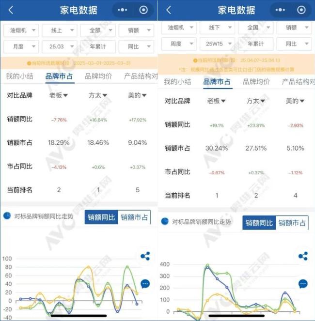 奥维数据罗盘的统计数据显示,今年3月,老板油烟机线上销额同比下降7.76%,市占同比下降4.13%。在老板电器的销售体系中,线下渠道是绝对的主力,但3月市占同样出现了小幅的缩水。