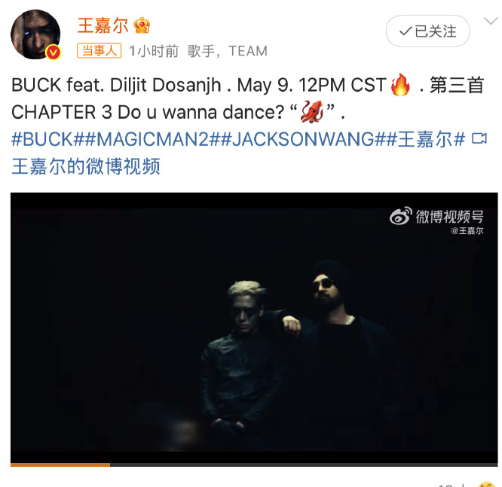 王嘉尔今日再次发布新歌《BUCK》预告,这首歌曲和印度超级巨星Diljit Dosanjh一起合作了!Diljit Dosanjh是首位登上Coachella以及Met Gala的旁遮普艺人,还曾与多位国际知名艺人合作!Jackson你真的每天都能把我胃口吊得很足,5月9日中午12:00坐等新歌上线!