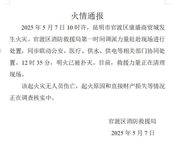 昆明官渡区一商贸城发生火灾 明火已被扑灭!5月7日10时许,昆明市官渡区的康盛商贸城发生火灾,事故未造成人员伤亡。事故发生后,官渡区消防救援局迅速调派救援力量赶赴现场处置,公安、医疗、供水、供电等相关部门也同步联动参与应急处置。12时35分,现场明火被扑灭。