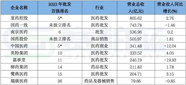 注:数据来源于各公司上市年报,2023年百强批发排名中,重药控股和中国医药按照重庆医药-中国医药联合体排名,供参考。
