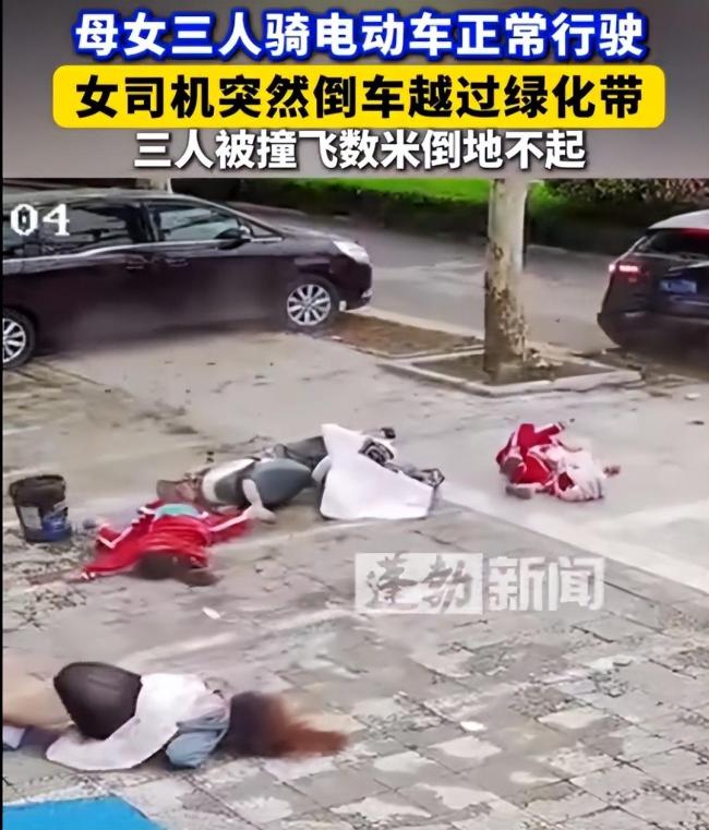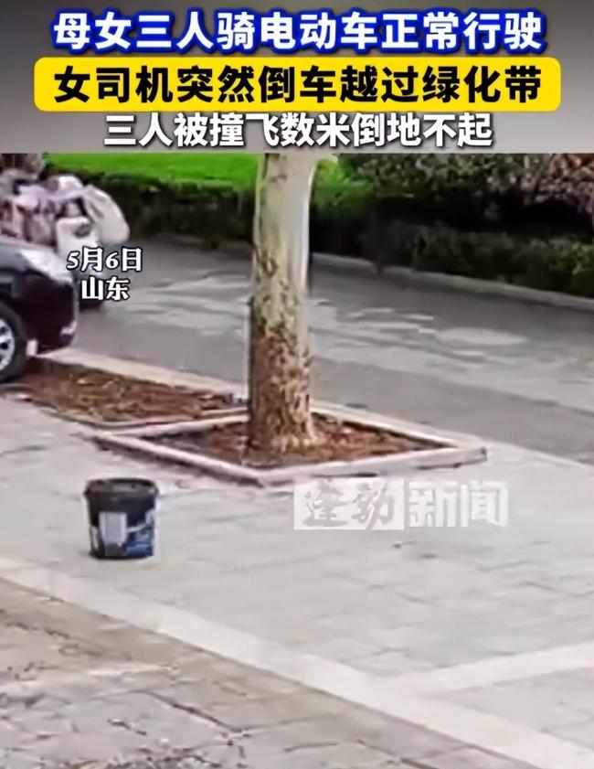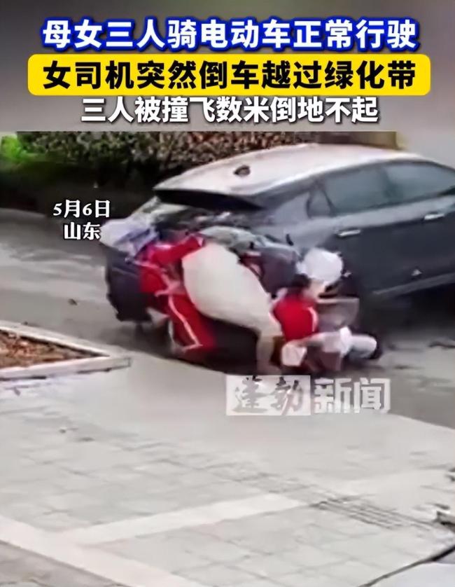 母女三人骑电动车被撞飞 绿化带倒车惹祸!5月6日,山东省发生了一起令人揪心的交通事故。母女三人骑着电动车在非机动车道上正常行驶时,突然被一辆倒车并越过绿化带的汽车撞飞数米远。三人瞬间倒地不起,事故现场十分惨烈。