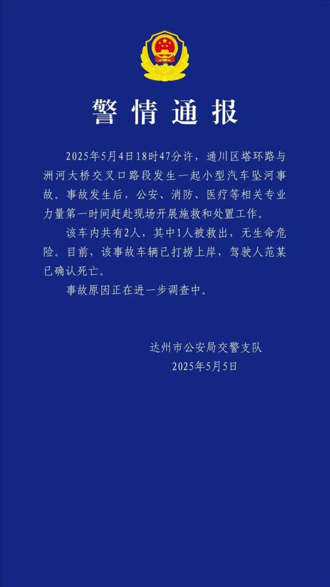 5月5日上午,达州市公安局交警支队发布警情通报称,5月4日18时47分许,通川区塔环路与洲河大桥交叉口路段发生一起小型汽车坠河事故。事故发生后,公安、消防、医疗等相关专业力量迅速赶到现场进行施救和处置工作。车内共有2人,其中1人被救出,无生命危险。目前,事故车辆已打捞上岸,驾驶人范某已确认死亡。事故原因正在进一步调查中。