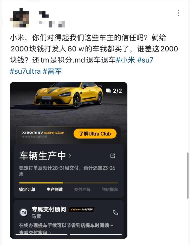 而在多个社交平台上,也有已经下定的小米SU7Ultra准车主要求退车。“小米,你对得起我们这些车主的信任吗?就给2000块钱打发人,60w的车我都买了,谁差这2000块钱,还是积分,退车退车。”一位小米SU7Ultra的准车主在某社交平台上写道。