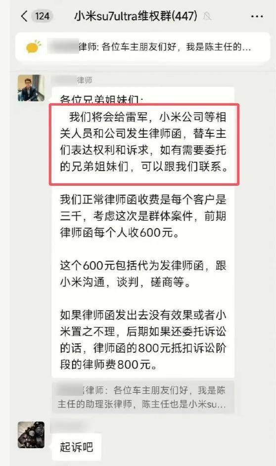 另外,有小米SU7Ultra车主还组建了维权群,有网传截图显示,某维权群内人数已达447人。群内一位律师表示,将会给雷军和小米公司等相关人员发律师函,正常律师函每个客户收费3000元,由于此次是群体事件,前期律师函每人收600元。这600元包括代为发律师函、跟小米沟通、谈判、磋商等。