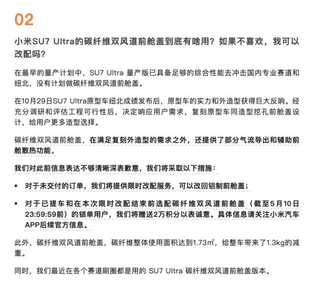 小米汽车方面强调,碳纤维双风道前舱盖,在满足复刻外造型的需求之外,还提供了部分气流导出和辅助前舱散热功能,并给整车带来了1.3kg的减重。但与此同时,小米方面承认此前信息表达不够清晰。小米方面表示,对于未交付的订单,将提供限时改配服务,可以改回铝制前舱盖;对于已提车和在本次限时改配结束前选配碳纤维双风道前舱盖(截至5月10日23:59:59前)的锁单用户,将赠送2万积分(价值2000元)。
