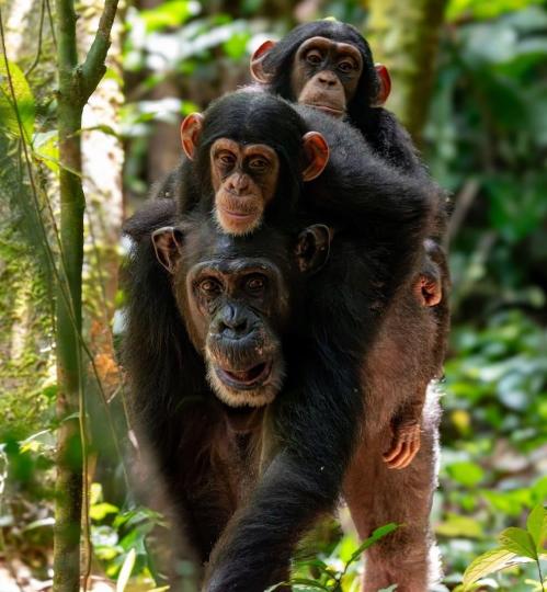 本项研究中的一只母黑猩猩背上背着一对双胞胎。(图片来自:塔伊黑猩猩项目AntoineValet)