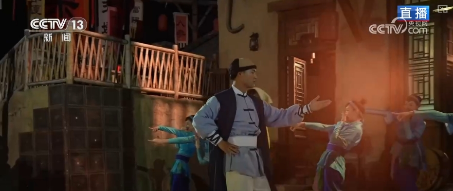 实际上,这处街道只是整场演出中的一幕。游客随演员一路向前,长达1个小时的剧情讲述了百年前一名外国导演来到郑州,寻找太极的故事。其间,会串联起景区的不同场景,比如走过繁华的“老郑州”街道,后面就变成了一个古朴的村落。置景取材于太极拳发源地之一的河南焦作陈家沟,村里既有讲述拜师学艺故事的情景剧,又有以太极功夫编排的舞蹈表演,体现出中原地区的多样历史文化。