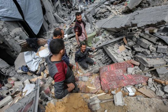 4月9日,人们在加沙城舒加艾耶社区搜寻以军轰炸幸存者。新华社发(里泽克·阿卜杜勒贾瓦德摄)
