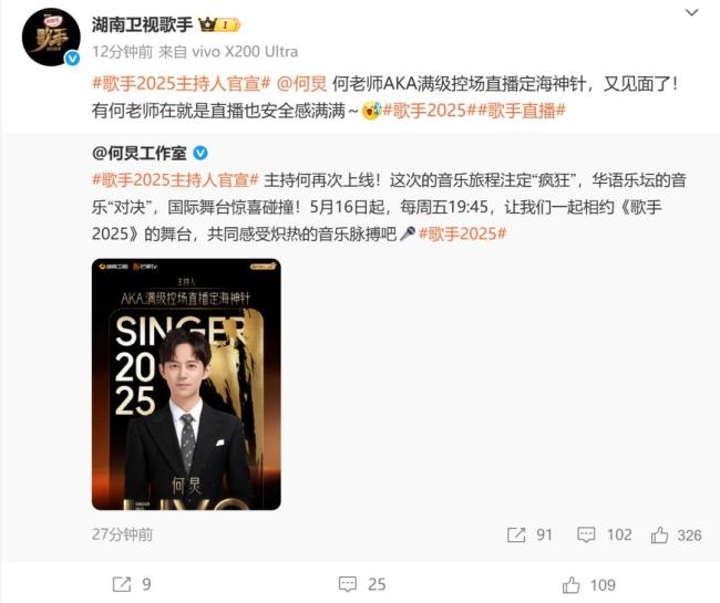 5月12日,湖南卫视和芒果TV宣布《歌手2025》的主持人将由何炅担任。官方表示:“何老师AKA满级控场直播定海神针,又见面了!有何老师在就是直播也安全感满满。”