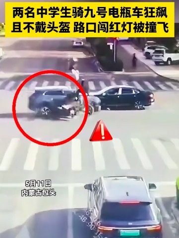 两名中学生骑九号电瓶车狂飙且不戴头盔,路口闯红灯被撞飞。