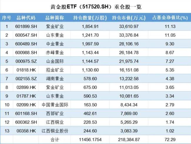 以规模最大的黄金股ETF(517520.SH)为例,该ETF底层资产为黄金产业链上市公司股票,其中66.9%持仓集中于黄金开采龙头企业,另外5.4%持仓集中于铜业龙头企业。