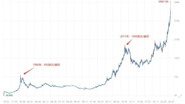 历史上黄金价格共产生过两轮暴涨行情,第一轮在1972—1980年,布雷顿森林体系崩溃,美元逐渐与黄金脱钩,黄金走向自由化;第二轮在2002年—2012年,伊拉克战争和次贷危机提升了黄金的避险需求,美元再度走弱刺激黄金价格上扬。