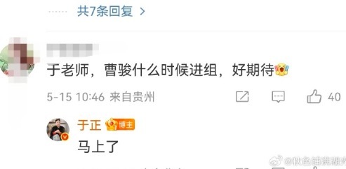 有粉丝问于正曹骏啥时候进组,于正说马上。好奇曹骏新剧是哪部新角色是啥样的。