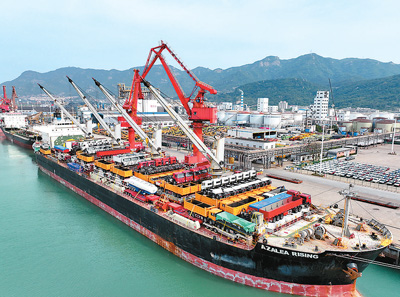 近日在江苏省连云港港东方港务分公司码头,货轮停在泊位有序装载“中国制造”工程机械车,准备出口海外。
