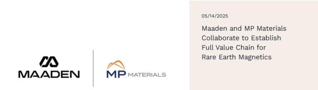 美国稀土企业MP Materials与沙特旗舰矿业公司Ma’aden签署了一份谅解备忘录,计划共同开发一条稀土供应链。双方的合作将涵盖稀土矿物的开采、分离、精炼和磁体生产。