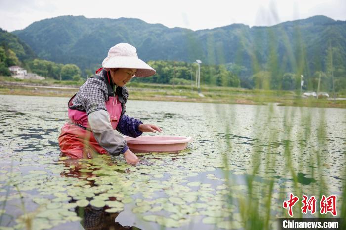近日,在湖北省恩施土家族苗族自治州咸丰县黄金洞乡五谷坪村的高山莼菜基地,身穿防水裤的村民们忙着采摘莼菜。莼菜被誉为“水中人参”,天生娇贵,对水质、土壤等生态环境要求非常高。近年来,咸丰县利用独特的生态环境,因地制宜发展莼菜、白茶等特色产业110万亩,助农增收致富,助力乡村振兴。廖祖英 摄