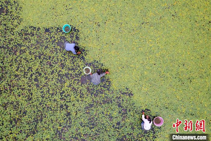 近日,在湖北省恩施土家族苗族自治州咸丰县黄金洞乡五谷坪村的高山莼菜基地,身穿防水裤的村民们忙着采摘莼菜。莼菜被誉为“水中人参”,天生娇贵,对水质、土壤等生态环境要求非常高。近年来,咸丰县利用独特的生态环境,因地制宜发展莼菜、白茶等特色产业110万亩,助农增收致富,助力乡村振兴。田润 摄