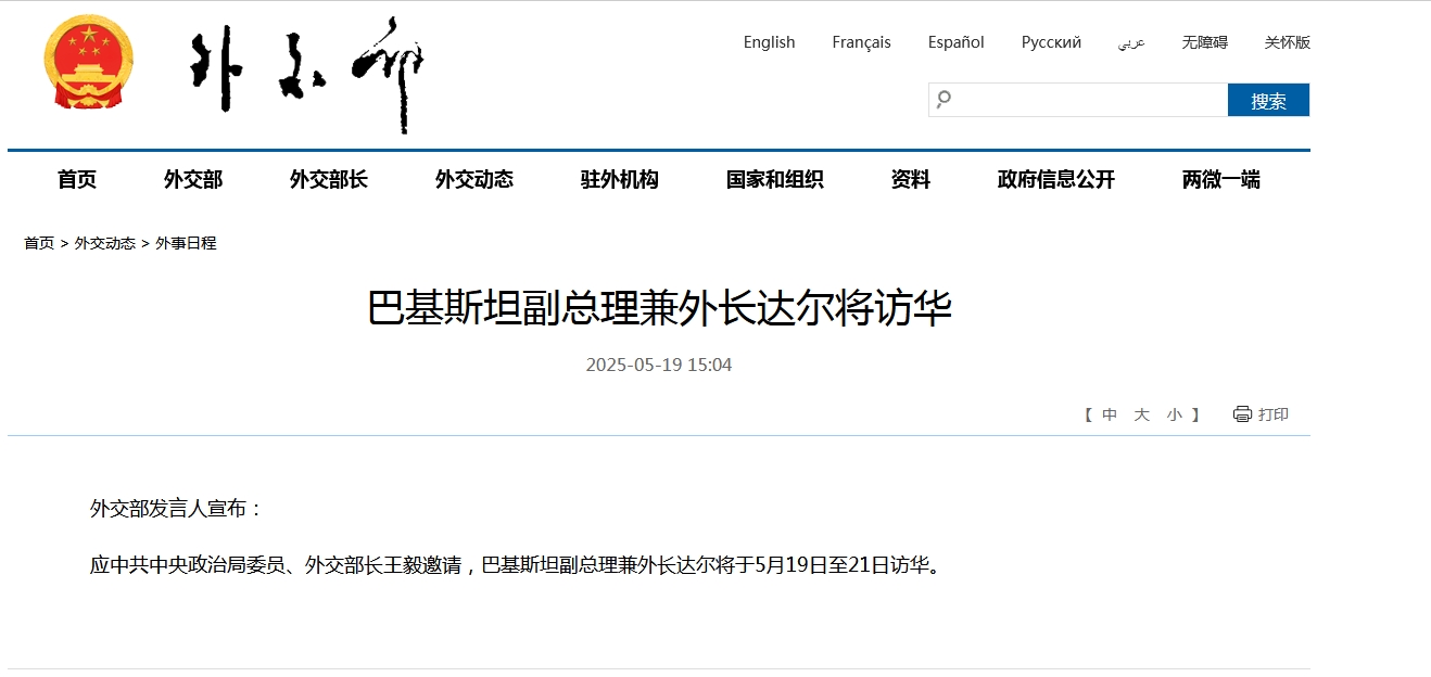 中新网5月19日电 据外交部网站消息,外交部发言人宣布:应中共中央政治局委员、外交部长王毅邀请,巴基斯坦副总理兼外长达尔将于5月19日至21日访华。